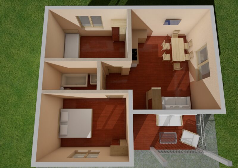 Две спальни 11,5 и 13 м2, кухня/гостиная – 22 м2, санузел – 4 м2 и лоджия - 9 м2.